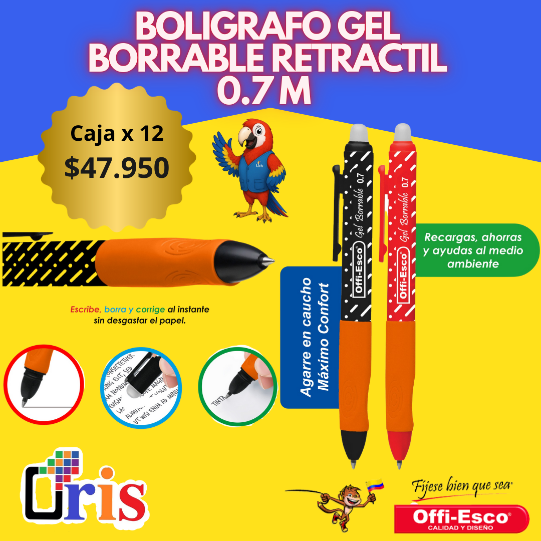 Tinta de Gel Borrable: Escritura suave con la posibilidad de borrar limpia y completamente cualquier error, utilizando la goma integrada en el clip o extremo.