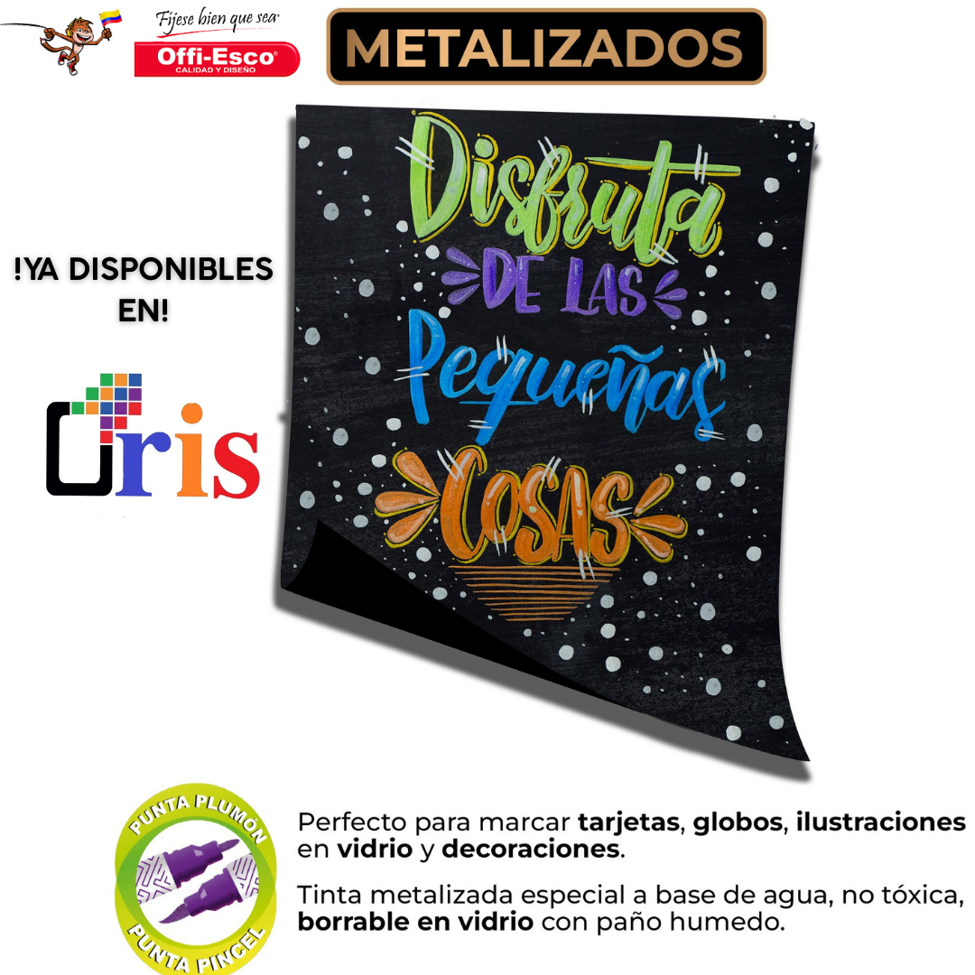 Tinta Metalizada Especial: Colores vibrantes con acabado brillante que destacan en fondos oscuros.