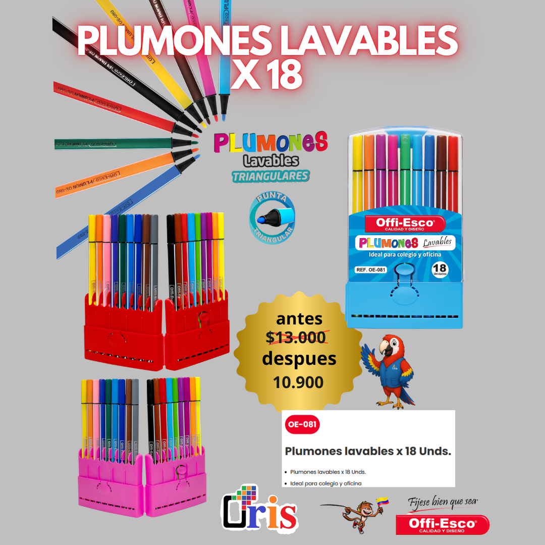 ¡Dale rienda suelta a la imaginación de los más pequeños! Con el set de Plumones Lavables Offi-Esco (OE-081), el arte y la limpieza van de la mano. Este estuche de 18 colores vibrantes es la herramienta ideal para el colegio, la oficina o las tardes de dibujo en casa, garantizando trazos brillantes y una limpieza total.